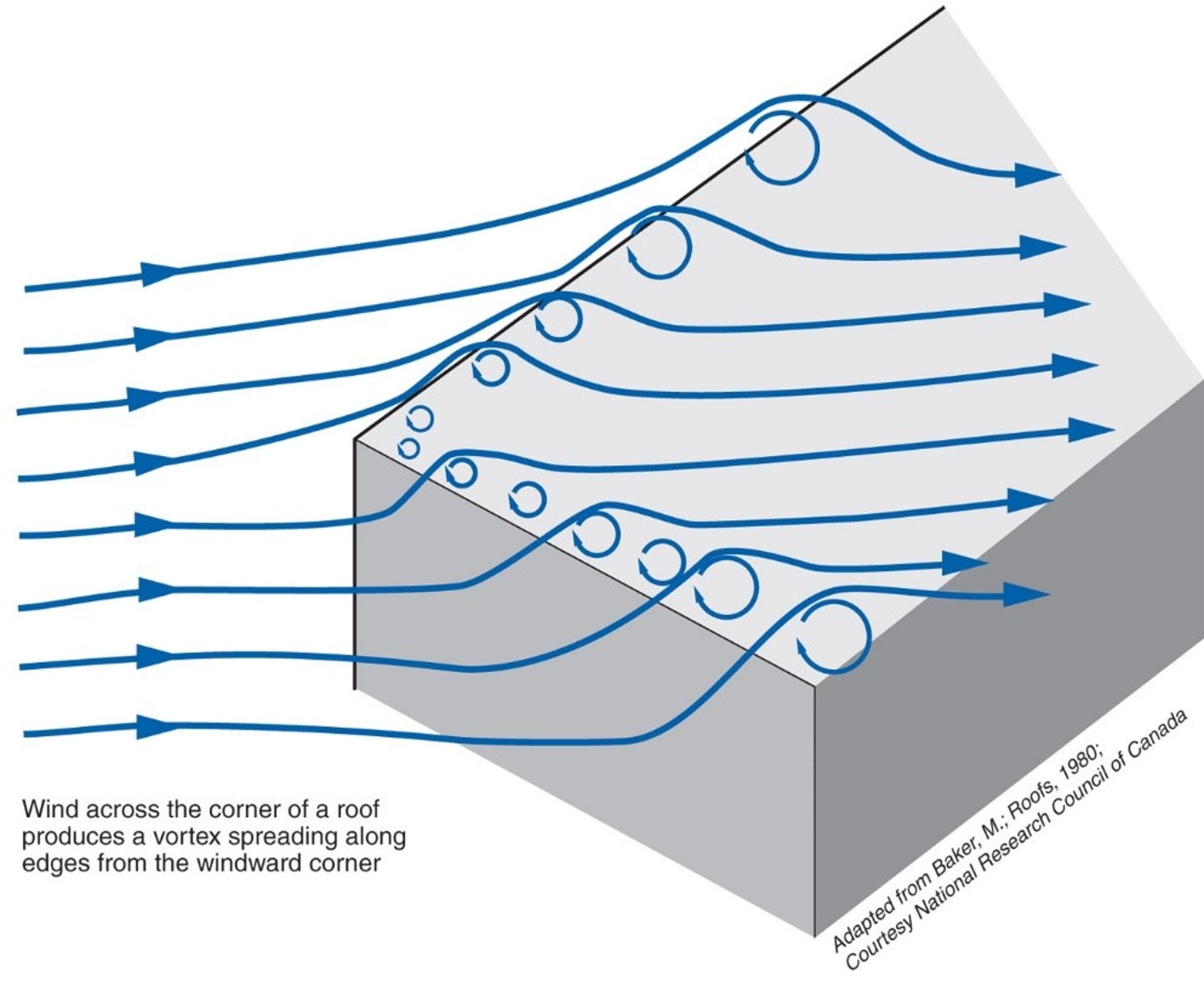 In high wind zones, the greatest point of stress in roof assemblies is at roof edges. Here, roofs experience the highest positive and negative air pressures. In addition, roof edges can also experience the greatest rainwater loads. Roof assemblies need to be able to resist the wind pressures that can act on them during high wind events such as hurricanes.